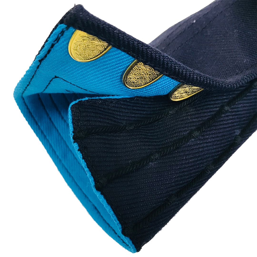 Blue and black fabric detail showing craftsmanship of Japanese workwear hand guards