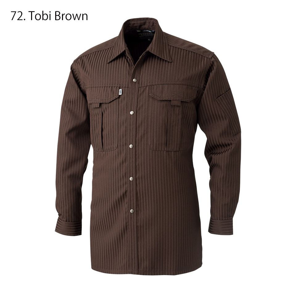 Front view of brown Toraichi tobi shirt made from polyester-cotton day-and-night weave with flap chest pockets